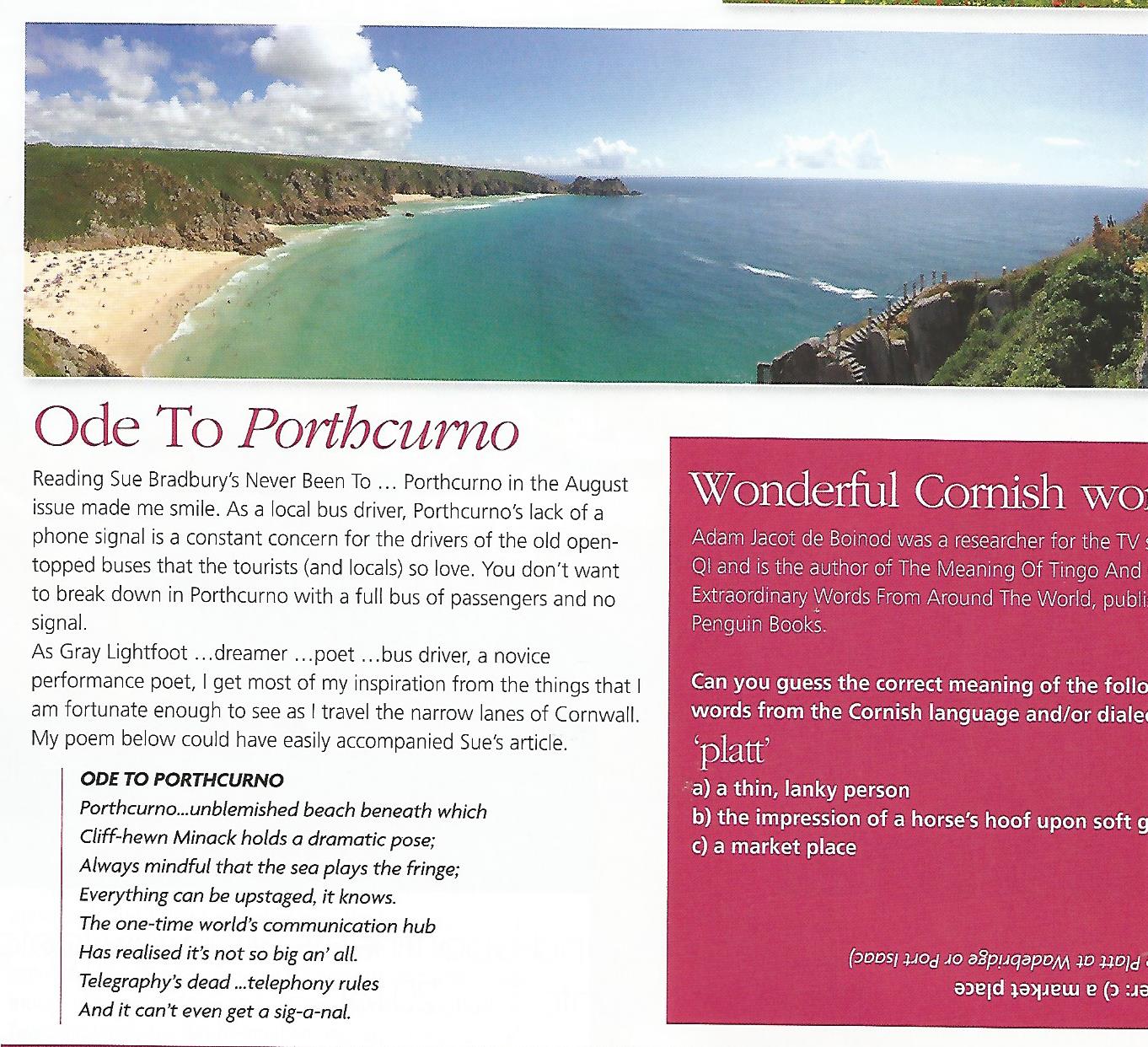 My poem ODE TO PORTHCURNO which juxtaposes the village’s obvious beauty with the sad irony that it is no longer the hub of the world’s communications has appeared in September’s issue of Cornwall Today. It would have been nice if they could have given my blog a plug but hey ho.