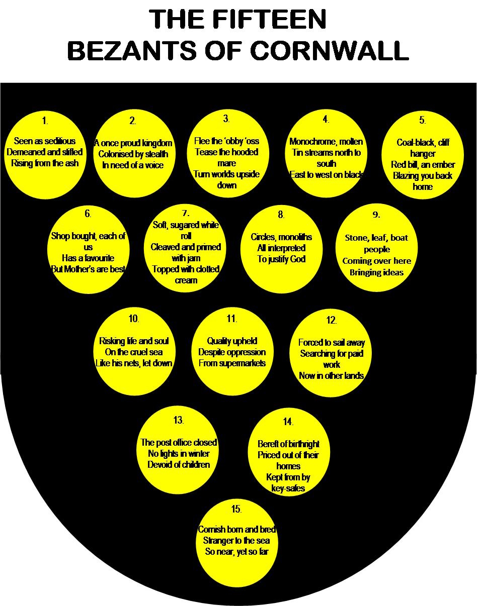 “Disciplined and ideal for crystallising experience and focusing reflection. The poems are in the measure called the besonnten (little bezant). It has fifteen syllables, one for each of the fifteen golden bezants on the black Cornish shield.”