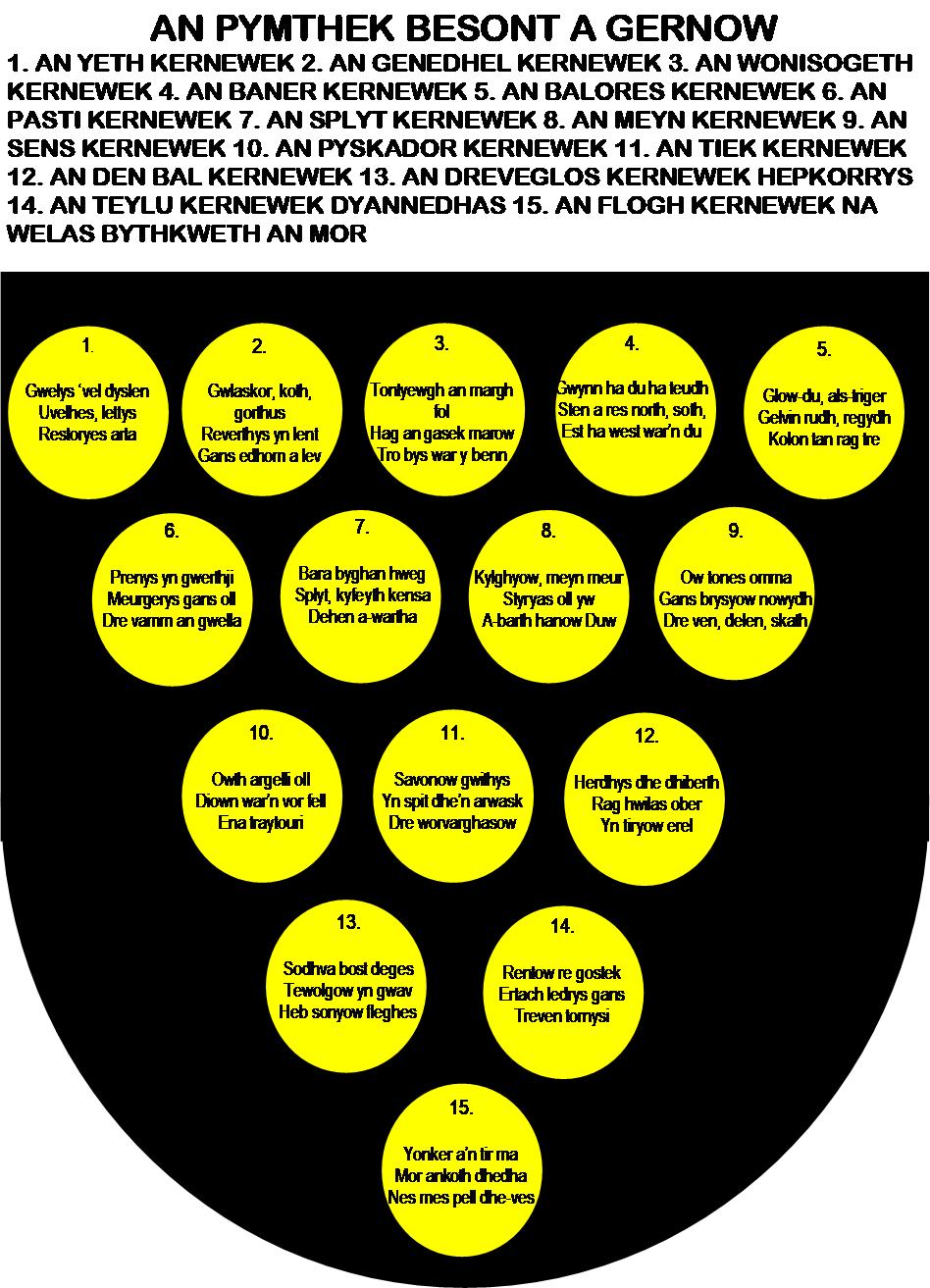In my previous post of The Fifteen Besants of Cornwall, I explained the history of this type of poetic form (and the history behind this particular form) and I would like to point out that the Cornish besonntennow below are not direct translations of the English versions because the need to adhere to the number of syllables would not work if translated directly. After each line is an English translation of the Cornish words.