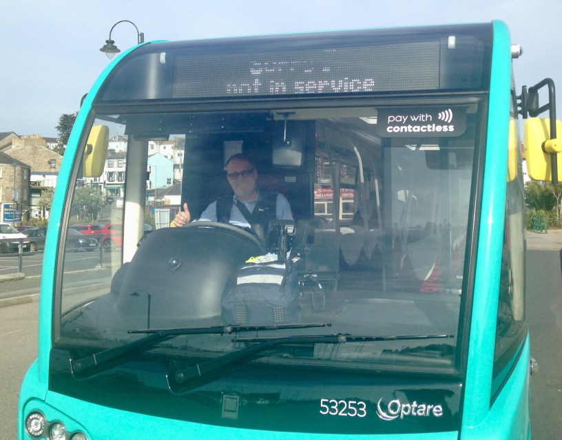 It’s surprisingly busy this early in the day, the start of the Penzance-Pendeen run. I distract Gray and he forgets to remind a travelling couple to disembark. Instead we make a new stop, Gray providing tour-guide instructions that not only get the two where they want to be but do so in the most agreeable, scenic manner. Their modest detour becomes a highlight as they carry on with thanks.